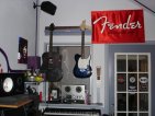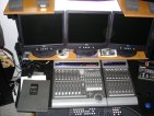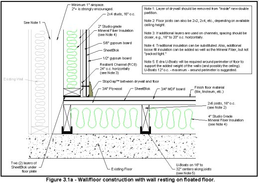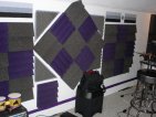 Studio construction began in the summer of 2003. I have 3 children and wanted to record in the evenings while they were sleeping. This would require as much noise isolation as reasonably possible. I found an excellent primer for anyone wanting to build a studio at http://www.acoustics101.com. This is part of the Auralex website (makers of acoustical foam products). Armed this information I began construction. The room was an unfinished attic space measuring approximately 28 x14 feet with 10 foot ceilings which had a/c and had been properly insulated. The room’s ceiling has a slope on one side. I applied acoustical foam in between each 2x4 not already insulated by standard pink insulation. The entire room was then sheeted in drywall. Next I began construction of a new subfloor. The subfloor is basically a frame built out of 2x4’s standing on edge spaced 1 foot apart and braced every 2 feet. Beneath the 2x4’s small rubber U shaped cups called U-boats (made by Auralex, http://www.auralex.com/sound_isolation_uboat/sound_isolation_uboat.asp, were placed every 2 feet. This decouples the subfloor from the rest of the house, reducing vibrations that would carry low frequencies throughout the house. Next, 4 inch thick studio grade mineral fiber insulation was placed in between the studs. The subfloor was then triple sheeted. The first layer was 1/2 particle board which was caulked at each seam. Next a layer of ½ inch drywall laid down. This was placed at 90 degree angles to avoid overlap of seams. Finally a third layer of particle board was laid, again at a 90 degree angle. The subfloor was complete and now it was time to build new walls which would attach to the new subfloor. This would created a room within a room with a 1 to 2 inch airspace in between the new and old walls. The new walls were sheeted back and front and insulated with mineral fiber insulations. Stringers were placed in between the 2x4’s at uneven intervals. In any location where electrical wire needed to go through a wall the holes were carefully caulked. Finally custom double paned windows were ordered and installed. The window in between the control room and isolation room had another piece of ¼ safety glass installed. There is a 2 inch airspace in between the double pane window and the safety glass. Next the room was textured with spayed drywall mud. Lastly the room was painted and carpeted. A very thick carpet padding was used. The diagram above is from Chapter 3 of acoustics 101.